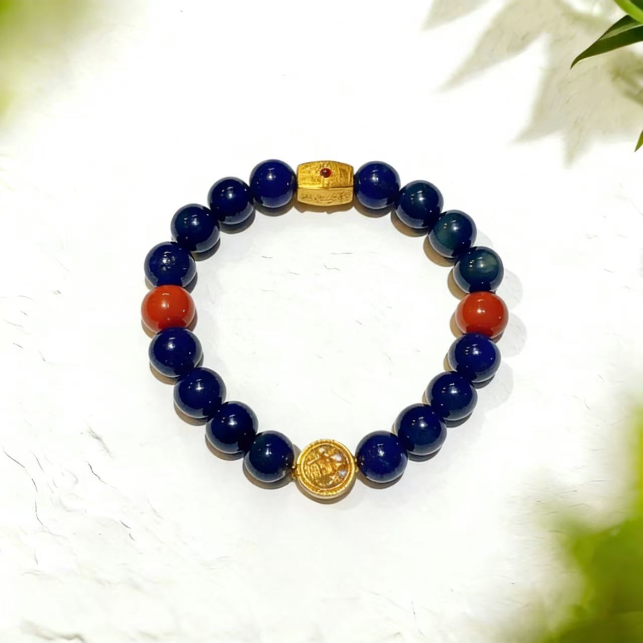 Natural Lapis Lazuli, crafted with ancient silver electroplated in 24k gold, and set with the Six-Syllable Mantra gemstone to bring you good fortune.